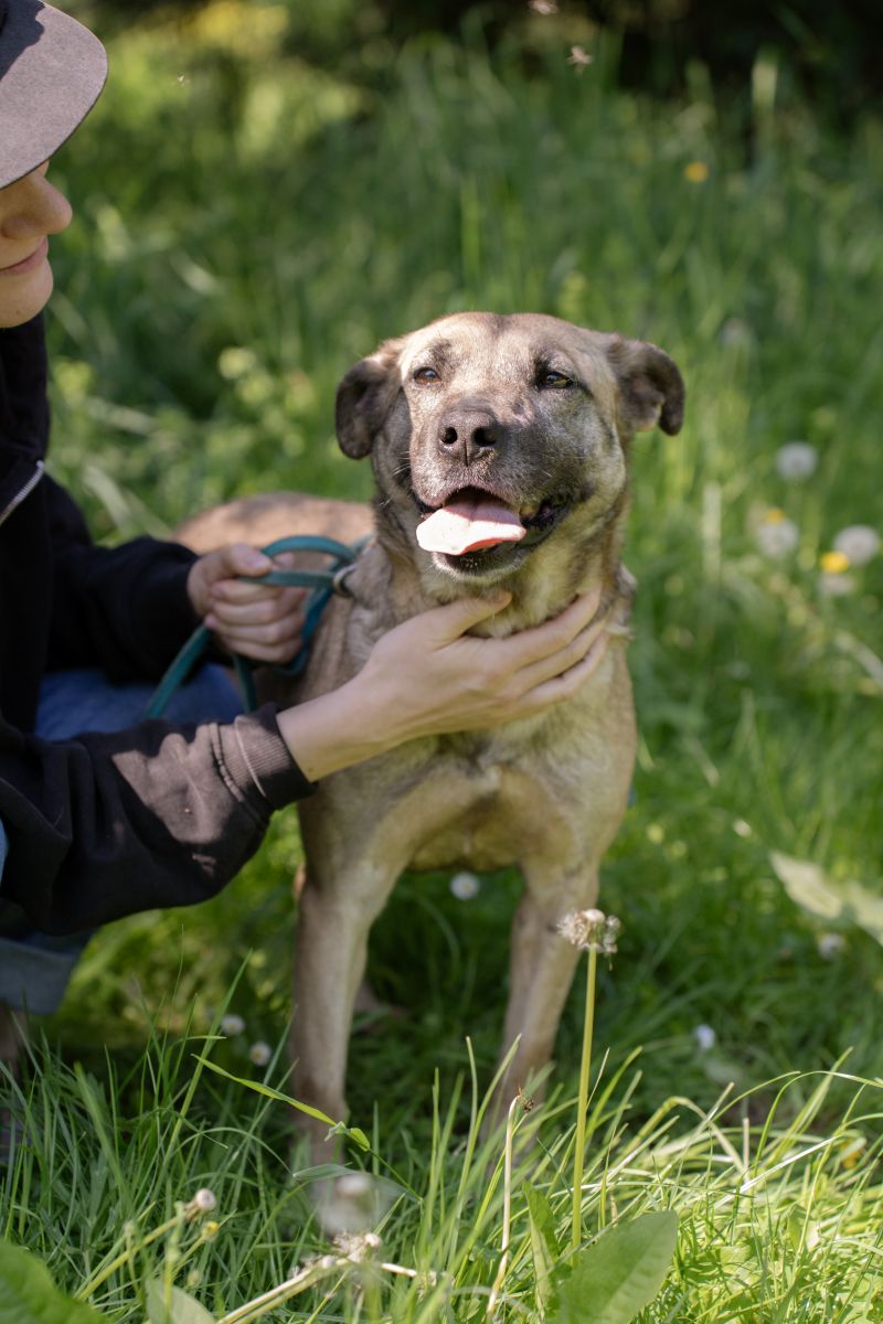 Bruna is Shy at first, needs to relax, loves people and is good with other dogs